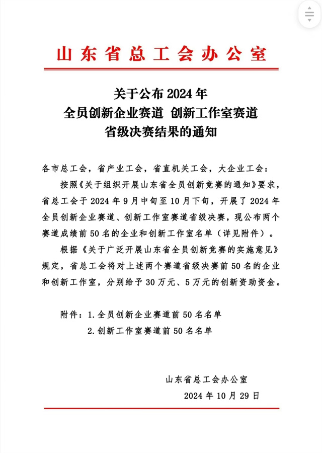 導(dǎo)讀:近日,山東省總工會(huì)公布了2024年全員創(chuàng)新企業(yè)賽道、創(chuàng)新工作室賽道名單,在全員創(chuàng)新企業(yè)賽道,公司成功入選!