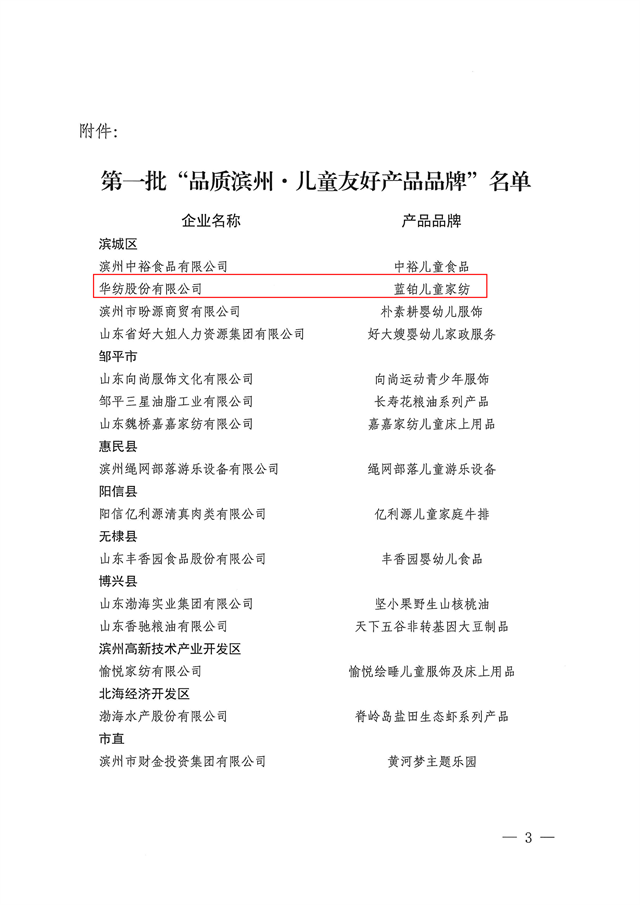 近日,市發(fā)展改革委、市婦聯(lián)、市市場監(jiān)管局聯(lián)合發(fā)布第一批“品質(zhì)濱州·兒童友好產(chǎn)品品牌”名單,公司藍(lán)鉑兒童家紡憑借卓越的品質(zhì)與貼心的設(shè)計成功入選。